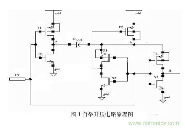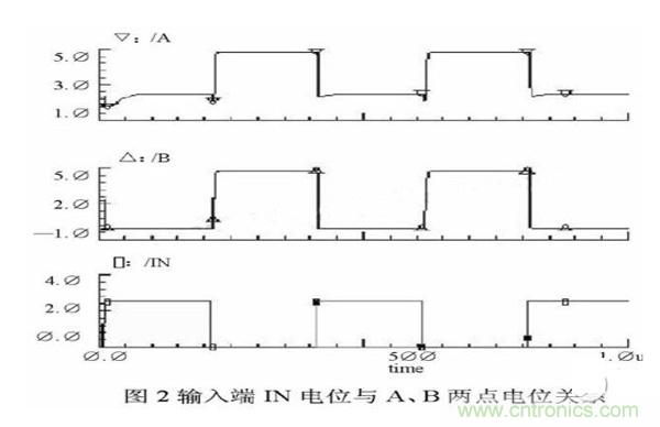 實際上,B點電位與負載電容和電容Cboot的大小有關,可以根據設計需要調整。具體關系將在介紹電路具體設計時詳細討論。在圖2中給出了輸入端IN電位與A、B兩點電位關系的示意圖。
