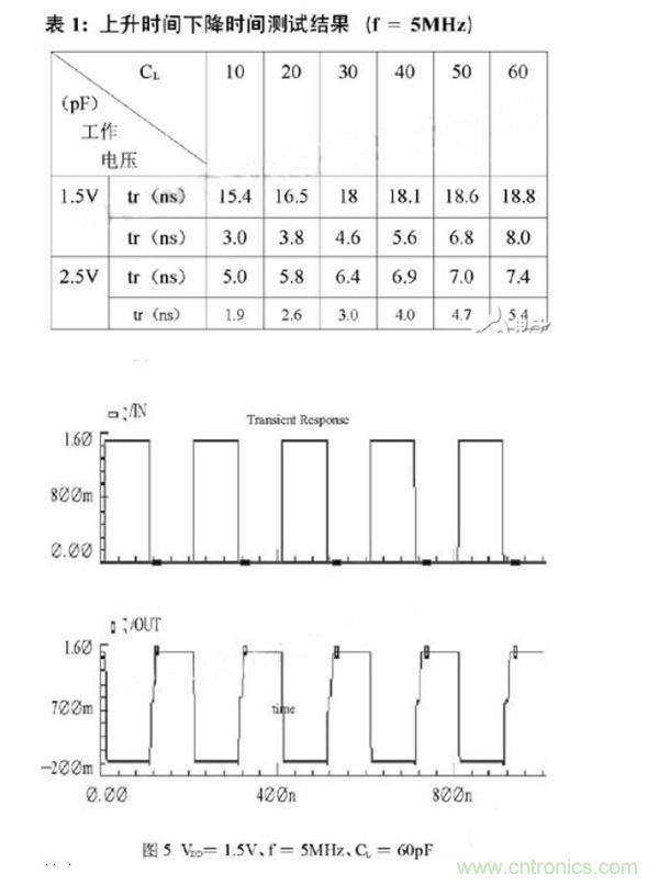 結合表1和圖5可以看出,此驅動電路能夠在工作電壓為1.5V,工作頻率為5MHz,并且負載電容高達60pF的條件下正常工作。它可以應用于低電壓、高工作頻率的DC-DC轉換器中作為開關管的驅動電路。