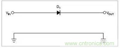 圖1.一只串聯二極管保護系統不受反向極性影響,二極管有0.7V的壓降。