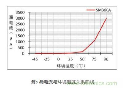其實對二極管漏電流影響最大的還是環境溫度,下圖5是在額定反壓下測試的關系曲線,從中可以看出:溫度越高,漏電流越大。在75℃后成直線上升,該點的漏電流是導致二極管外殼在額定電流下達到125℃的兩大因素之一,只有通過降額反向電壓和正向導通電流才能降低二極管的工作溫度。