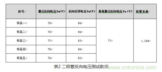 我們都知道二極管有個反向擊穿的極限電壓,絕大多數的二極管廠商都沒把它寫入數據手冊,但在大多數情況下為了節省成本不可能將二極管反向耐壓降額到50%左右使用,那么反向電壓裕量是否足夠,這對評估該二極管反向耐壓應降多少額使用較為安全是有一定意義的。從下表中可看出,反向電壓的裕量并不像網上所說的那樣是額定反壓的2~3倍。