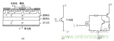 IGBT相當于一個由MOSFET驅動的厚基區GTR。從圖中我們還可以看到在集電極和發射極之間存在著一個寄生晶閘管,寄生晶閘管有擎住作用。采用空穴旁路結構并使發射區寬度微細化后可基本上克服寄生晶閘管的擎住作用。IGBT的低摻雜N漂移區較寬,因此可以阻斷很高的反向電壓。