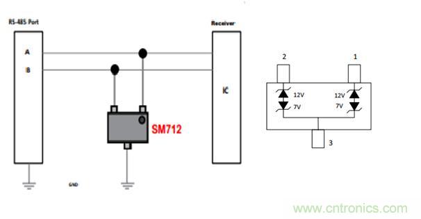 對RS485接口的特點是收發電平的不對稱,為7V 和12V,所以需要專門設計不對稱的保護芯片,而SM712 SOT-23封裝,專為保護具有非對稱工作電壓(-7V至12V)的RS-485應用而設計,使其免受靜電放電(ESD)、電氣快速瞬變(EFT)和雷電引致的浪涌電流帶來的危害。 它能吸收高于IEC 61000-4-2國際標準規定之最高級別的反復性ESD放電 30KV,無需擔心其性能發生減退,并可在極低的箝位電壓下安全地耗散19A的8/20μs波形浪涌電流(IEC61000-4-5)。