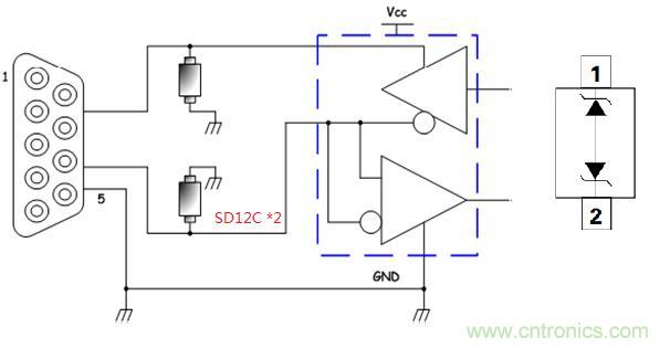 RS232接口一般為內部配置接口,或短距離低速通信口,但此接口經常插拔,需要采用功率300W以上產品進行靜電和浪涌保護,所以需采用SOD-323封裝的SD12C或SD15C(根據客戶芯片的工作電壓波動不同)來保護收發2路信號。