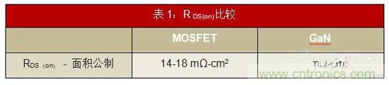 • 較低的RDS(on):如表1所示,GaN的MOSFET面積為RDS(on)的一半。這直接使電路中傳導(dǎo)損耗降低了50%。因此,您可以在設(shè)計(jì)中使用較小的散熱器和更簡(jiǎn)單的熱管理。