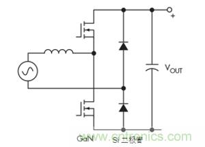 一種替代方案是連續(xù)導(dǎo)通模式圖騰柱拓?fù)洹_@種拓?fù)浣Y(jié)構(gòu)充分利用了GaN的所有關(guān)鍵特性,最終導(dǎo)致尺寸更小、工作頻率更高的設(shè)計(jì)(圖4)。GaN的零反向恢復(fù)對(duì)于實(shí)現(xiàn)該拓?fù)涮貏e重要。
