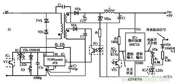 【導(dǎo)讀】開關(guān)電源部分主要由TOP Switch FX(IC1)、光耦合器(IC2)組成。控制電路則包括微控制器(MCU)、兩片LTV817A線性光耦合器(IC3、IC4)、按鈕開關(guān)SB。
