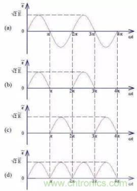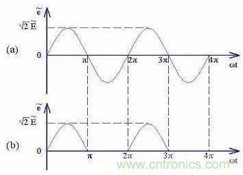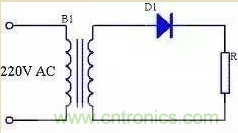 半波整流電路見下圖。其中B1是電源變壓器,D1是整流二極管,R1是負載。B1次級是一個方向和大小隨時間變化的正弦波電壓,波形如圖2所示。0~π期間是這個電壓的正半周,這時B1次級上端為正下端為負,二極管D1正向導通,電源電壓加到負載R1上,負載R1中有電流通過;π~2π期間是這個電壓的負半周,這時B1次級上端為負下端為正,二極管D1反向截止,沒有電壓加到負載R1上,負載R1中沒有電流通過。在 2π~3π、3π~4π等后續周期中重復上述過程,這樣電源負半周的波形被“削”掉,得到一個單一方向的電壓,波形如圖3所示。由于這樣得到的電壓波形大小還是隨時間變化,我們稱其為脈動直流。