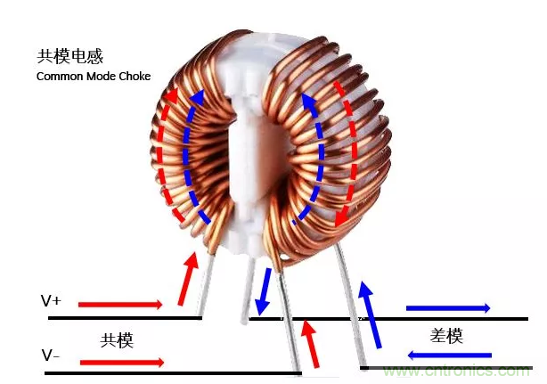 換一個方式理解:當V+上流過一個頻率的共模干擾,形成的交變磁場,會在另一個線圈上形成一個感應電流,根據左手定則,感應電流的方向與V-上共模干擾的方向相反,就抵消了一部分,減小了共模干擾。