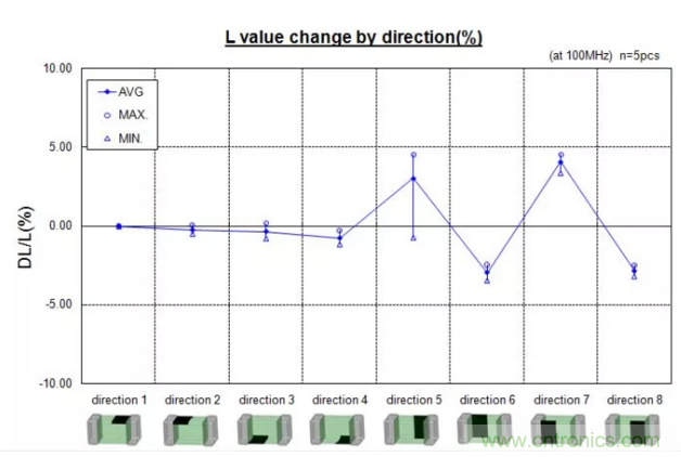 可以看出,標記點朝側面,感值變化較大,所以貼片時應注意讓電感上的標記點朝上。