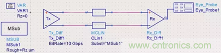 前面說(shuō)到,銅箔的粗糙度會(huì)影響到信號(hào)完整性,那么我們就來(lái)做一個(gè)實(shí)驗(yàn)看看。原理圖如下所示,把銅箔粗糙度的設(shè)置為一個(gè)變量,初始值為0,仿真的速率為10Gbps: