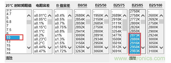 圖2,Digi-Key網站NTC參數比較與篩選