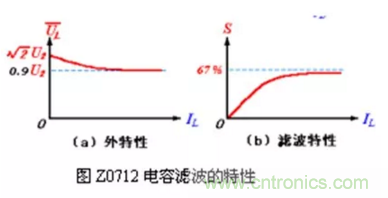 4. 電容濾波電路的外特性(指UL與IL之間的關系)和脈動特性(指S與IL 之間的關系)比較差,如圖Z0712 所示。可以看出輸出電壓UL和脈動系數S隨著輸出電流IL 的變化而變化。當IL=0(即RL= ∞ )時,UL = U2(電容充電到最大值后不再放電),S = 0。當IL增大(即RL減小)時,由于電容放電程度加快而使UL下降,UL 的變化范圍在 U2 ~0.9 U2之間(指全波或橋式),S變大。所以,電容濾波一般適用于負載電流變化不大的場合。