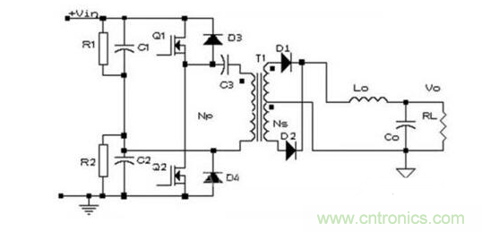 電容器C1和C2與開關管Q1、Q2組成橋,橋的對角線接變壓器T1的原邊繞組,故稱半橋變換器。如果此時C1=C2,那么當某一開關管導通時,繞組上的電壓只有電源電壓的一半。