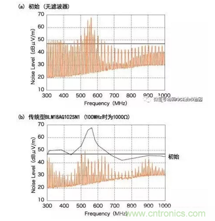 傳統(tǒng)型BLM18AG對300MHz和700MHz之間頻率范圍內的噪聲抑制十分有效。