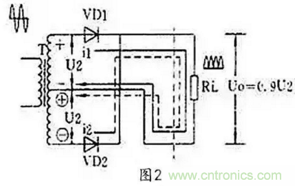 全波整流則是要用到二個(gè)二極管,ASEMI工程上也會要求需要有帶中心抽頭的兩個(gè)次級線圈,這兩個(gè)次級線圈需要圈數(shù)相同,以保證相同的電阻。詳細(xì)的情況我們可以看下圖2,負(fù)載RL得到的就是全波整流電流,輸出電壓比半波整流電路要高。