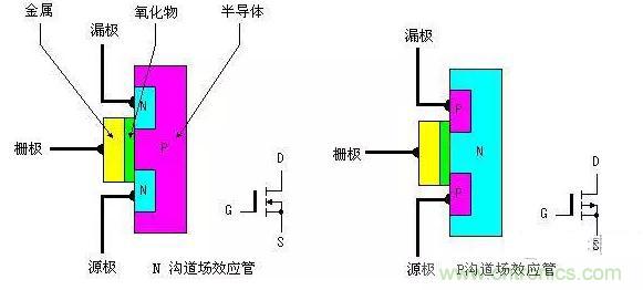 功率MOSFET的內部結構和電氣符號如圖所示,它可分為 NPN型和PNP型。NPN型通常稱為N溝道型,PNP型通常稱P溝道型。由圖1可看出,對于N溝道型的場效應管其源極和漏極接在N型半導體上,同樣對于P 溝道的場效應管其源極和漏極則接在P型半導體上。我們知道一般三極管是由輸入的電流控制輸出的電流。但對于場效應管,其輸出電流是由輸入的電壓(或稱場電壓)控制,可以認為輸入電流極小或沒有輸入電流,這使得該器件有很高的輸入阻抗,同時這也是我們稱之為場效應管的原因。