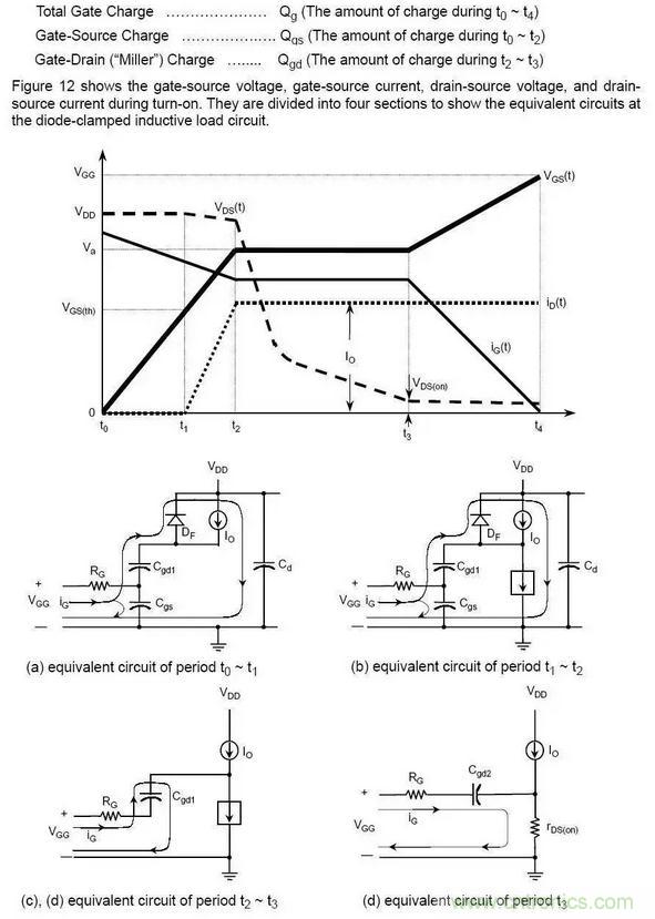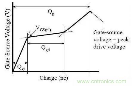Qgs從0電荷開(kāi)始到第一個(gè)拐點(diǎn)處,Qgd是從第一個(gè)拐點(diǎn)到第二個(gè)拐點(diǎn)之間部分(也叫做“米勒”電荷),Qg是從0點(diǎn)到VGS等于一個(gè)特定的驅(qū)動(dòng)電壓的部分。