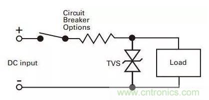 在實際的電路中,如圖2所示,在DC input的時候,有時由于供電環境的變化會帶來一些瞬時脈沖。而要消除瞬時脈沖對器件損害的最好辦法,就是將瞬時電流從敏感器件引到地,一般具體做法是將TVS在線路板上與被保護線路并聯。這樣,當瞬時電壓超過電路正常工作電壓后,TVS將發生雪崩擊穿,從而提供給瞬時電流一個超低阻抗的通路,其結果是瞬時電流通過TVS被短路到GND,從而避開被保護器件,并且在電壓恢復正常值之前使被保護回路一直保持截止電壓。而當瞬時脈沖結束以后,TVS二極管再自動恢復至高阻狀態,整個回路又回到正常電壓狀態。