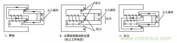 由永久磁鐵保持釋放狀態,加上工作電壓后,電磁感應使銜鐵與永久磁鐵產生吸引和排斥力矩,產生向下的運動,最后達到吸合狀態。