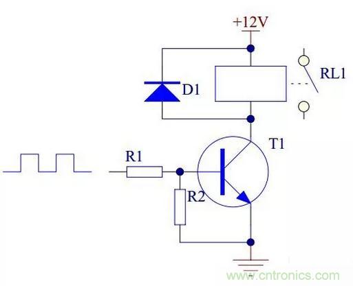 電路中各元器件的作用:晶體管T1為控制開關;電阻R1主要起限流作用,降低晶體管T1功耗;電阻R2使晶體管T1可靠截止;二極管D1反向續流,為三極管由導通轉向關斷時為繼電器線圈中的提供泄放通路,并將其電壓箝位在+12V上。