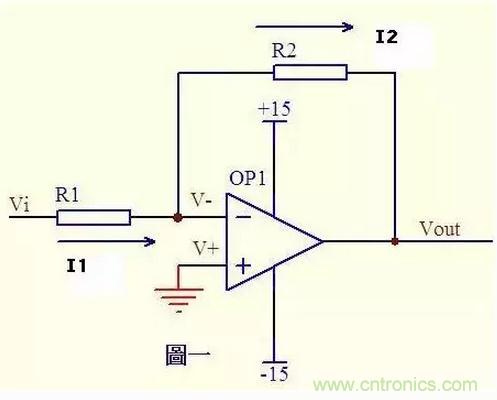 圖一運(yùn)放的同向端接地=0V,反向端和同向端虛短,所以也是0V,反向輸入端輸入電阻很高,虛斷,幾乎沒(méi)有電流注入和流出,那么R1和R2相當(dāng)于是串聯(lián)的,流過(guò)一個(gè)串聯(lián)電路中的每一只組件的電流是相同的,即流過(guò)R1的電流和流過(guò)R2的電流是相同的。 流過(guò)R1的電流I1 = (Vi - V-)/R1 ……a 流過(guò)R2的電流I2 = (V- - Vout)/R2 ……b V- = V+ = 0 ……c I1 = I2 ……d 求解上面的初中代數(shù)方程得Vout = (-R2/R1)*Vi 這就是傳說(shuō)中的反向放大器的輸入輸出關(guān)系式了。