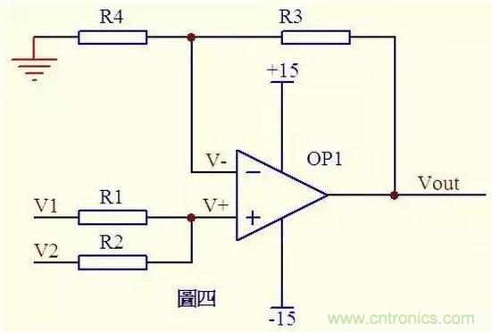圖三中,由虛短知: V- = V+ = 0 ……a 由虛斷及基爾霍夫定律知,通過(guò)R2與R1的電流之和等于通過(guò)R3的電流, 故 (V1 – V-)/R1 + (V2 – V-)/R2 = (Vout – V-)/R3 ……b 代入a式,b式變?yōu)閂1/R1 + V2/R2 = Vout/R3 如果取R1=R2=R3,則上式變?yōu)閂out=V1+V2,這就是傳說(shuō)中的加法器了。