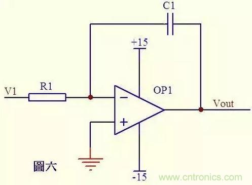 圖六電路中,由虛短知,反向輸入端的電壓與同向端相等,由虛斷知,通過(guò)R1的電流與通過(guò)C1的電流相等。 通過(guò)R1的電流 i=V1/R1 通過(guò)C1的電流i=C*dUc/dt=-C*dVout/dt 所以 Vout=((-1/(R1*C1))∫V1dt 輸出電壓與輸入電壓對(duì)時(shí)間的積分成正比,這就是傳說(shuō)中的積分電路了。 若V1為恒定電壓U,則上式變換為Vout = -U*t/(R1*C1) t 是時(shí)間,則Vout輸出電壓是一條從0至負(fù)電源電壓按時(shí)間變化的直線。