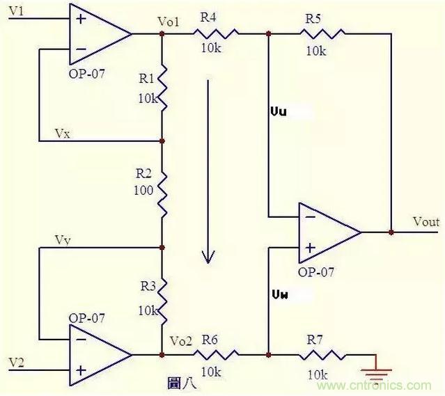圖八.由虛短知 Vx = V1 ……a Vy = V2 ……b 由虛斷知,運(yùn)放輸入端沒(méi)有電流流過(guò),則R1、R2、R3可視為串聯(lián),通過(guò)每一個(gè)電阻的電流是相同的, 電流I=(Vx-Vy)/R2 ……c 則: Vo1-Vo2=I*(R1+R2+R3) = (Vx-Vy)(R1+R2+R3)/R2 ……d 由虛斷知,流過(guò)R6與流過(guò)R7的電流相等,若R6=R7, 則Vw = Vo2/2 ……e 同理若R4=R5,則Vout – Vu = Vu – Vo1,故Vu = (Vout+Vo1)/2 ……f 由虛短知,Vu = Vw ……g 由efg得 Vout = Vo2 – Vo1 ……h 由dh得 Vout = (Vy –Vx)(R1+R2+R3)/R2 上式中(R1+R2+R3)/R2是定值,此值確定了差值(Vy –Vx)的放大倍數(shù)。 這個(gè)電路就是傳說(shuō)中的差分放大電路了。