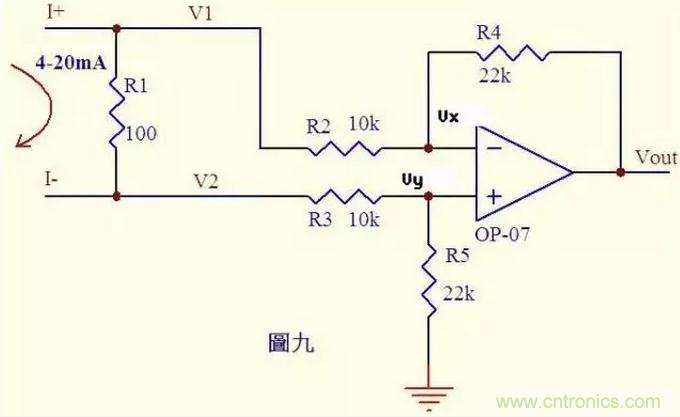 分析一個(gè)大家接觸得較多的電路。很多控制器接受來(lái)自各種檢測(cè)儀表的0~20mA或4~20mA電流,電路將此電流轉(zhuǎn)換成電壓后再送ADC轉(zhuǎn)換成數(shù)字信號(hào),圖九就是這樣一個(gè)典型電路。如圖4~20mA電流流過(guò)采樣100Ω電阻R1,在R1上會(huì)產(chǎn)生0.4~2V的電壓差。由虛斷知,運(yùn)放輸入端沒(méi)有電流流過(guò),則流過(guò)R3和R5的電流相等,流過(guò)R2和R4的電流相等。 故: (V2-Vy)/R3 = Vy/R5 ……a (V1-Vx)/R2 = (Vx-Vout)/R4 ……b 由虛短知: Vx = Vy ……c 電流從0~20mA變化,則V1 = V2 + (0.4~2) ……d 由cd式代入b式得(V2 + (0.4~2)-Vy)/R2 = (Vy-Vout)/R4 ……e 如果R3=R2,R4=R5,則由e-a得Vout = -(0.4~2)R4/R2 ……f 圖九中R4/R2=22k/10k=2.2,則f式Vout = -(0.88~4.4)V,即是說(shuō),將4~20mA電流轉(zhuǎn)換成了-0.88 ~ -4.4V電壓,此電壓可以送ADC去處理。