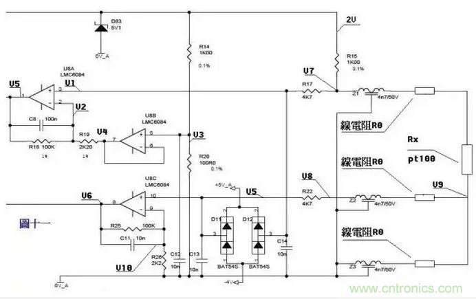 來(lái)一個(gè)復(fù)雜的,圖十一是一個(gè)三線制PT100前置放大電路。PT100傳感器引出三根材質(zhì)、線徑、長(zhǎng)度完全相同的線,接法如圖所示。有2V的電壓加在由R14、R20、R15、Z1、PT100及其線電阻組成的橋電路上。Z1、Z2、Z3、D11、D12、D83及各電容在電路中起濾波和保護(hù)作用,靜態(tài)分析時(shí)可不予理會(huì),Z1、Z2、Z3可視為短路,D11、D12、D83及各電容可視為開(kāi)路。 由電阻分壓知, V3=2*R20/(R14+20)=200/1100=2/11 ……a 由虛短知,U8B第6、7腳 電壓和第5腳電壓相等 V4=V3 ……b 由虛斷知,U8A第2腳沒(méi)有電流流過(guò),則流過(guò)R18和R19上的電流相等。 (V2-V4)/R19=(V5-V2)/R18 ……c 由虛斷知,U8A第3腳沒(méi)有電流流過(guò), V1=V7 ……d 在橋電路中R15和Z1、PT100及線電阻串聯(lián),PT100與線電阻串聯(lián)分得的電壓通過(guò)電阻R17加至U8A的第3腳, V7=2*(Rx+2R0)/(R15+Rx+2R0) …..e 由虛短知,U8A第3腳和第2腳電壓相等, V1=V2 ……f 由abcdef得, (V5-V7)/100=(V7-V3)/2.2 化簡(jiǎn)得 V5=(102.2*V7-100V3)/2.2 即 V5=204.4(Rx+2R0)/(1000+Rx+2R0) – 200/11 ……g 上式輸出電壓V5是Rx的函數(shù) 我們?cè)倏淳€電阻的影響。Pt100最下端線電阻上產(chǎn)生的電壓降經(jīng)過(guò)中間的線電阻、Z2、R22,加至U8C的第10腳,由虛斷知, V5=V8=V9=2*R0/(R15+Rx+2R0) ……a (V6-V10)/R25=V10/R26 ……b 由虛短知, V10=V5 ……c 由式abc得 V6=(102.2/2.2)V5=204.4R0/[2.2(1000+Rx+2R0)] ……h 由式gh組成的方程組知,如果測(cè)出V5、V6的值,就可算出Rx及R0,知道Rx,查pt100分度表就知道溫度的大小了。