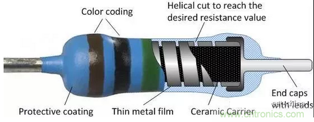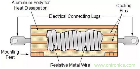 繞線電阻是將鎳鉻合金導(dǎo)線繞在氧化鋁陶瓷基底上,一圈一圈控制電阻大小。繞線電阻可以制作為精密電阻,容差可以到0.005%,同時溫度系數(shù)非常低,缺點(diǎn)是繞線電阻的寄生電感比較大,不能用于高頻。繞線電阻的體積可以做的很大,然后加外部散熱器,可以用作大功率電阻。