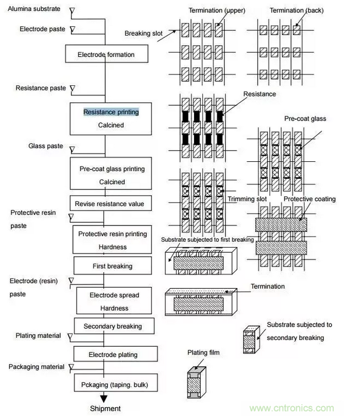 厚膜電阻采用的絲網(wǎng)印刷法,就是再陶瓷基底上貼一層鈀化銀電極,然后在電極之間印刷一層二氧化釕作為電阻體。厚膜電阻的電阻膜通常比較厚,大約100微米。具體工藝流程如下圖所示。