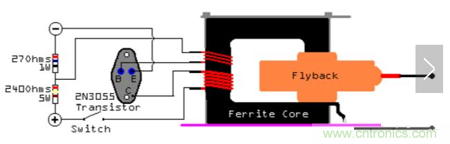我們可以采用單管自激推高壓包的方法來產生高壓。我們使用一個2N3055三極管。