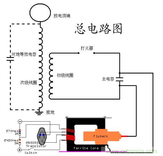 SGTC的原理就是先給電容充電,電容的電壓達到一定程度時,在打火器出放出電弧,形成一個回路,然后放電,之后重新開始這個循環。