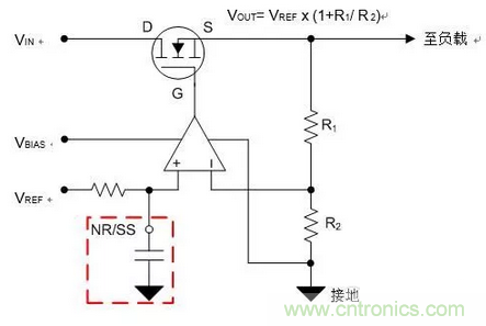 TI的許多低噪聲LDO系列都具有專門用作“NR/SS”的專用引腳,如圖 3 所示。