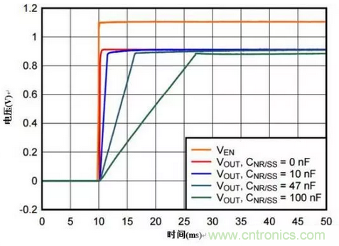 (1)為降低啟動電流,您必須減小輸出電容或降低壓擺率。幸好,CNR/SS 有助實現后者,如圖 5 TPS7A85所示。