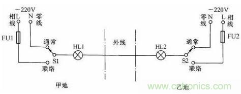 在某些生產過程中,需要兩地的生產人員能傳遞簡單的信息,以協調工作。圖22所示是用一根導線傳遞聯絡信號線路。兩地中各有一只雙擲開關控制信號燈聯絡,信號燈分別裝在兩地,一地一個。當甲地向乙地發聯絡信號時,撥動開關S1,乙地的指示燈亮,待乙地完成甲地所指示的任務后,乙地可把開關撥至“聯絡”位置,通知甲地工作已完成。