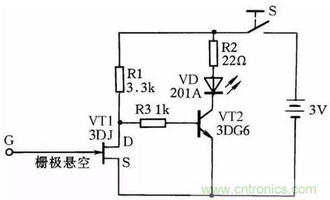 圖28所示是一感應測電筆線路。它可方便地測出導線的斷芯位置。在用來測導線斷芯位置時,在導線一端接上220V的電源相線,然后用感應測電筆的探頭柵極靠近被測導線,并沿線移動。如果發光二極管在移動中突然熄滅,那么此處便是導線斷芯位置。