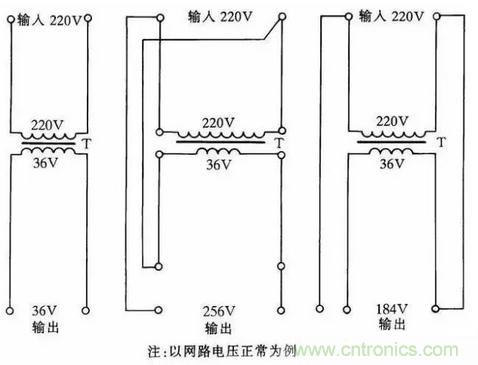 圖中的黑圓點表示繞組的同名端。如果將初、次級的連接線改為同名端相連;則輸出電壓將降低6.3V。采用這種接法;負載電流不得大于初、次級的額定電流。網路電壓如經常比220V低(或高)30~40V;可選220V/36V的變壓器連接。