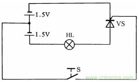 利用圖30所示的簡便方法可檢查晶閘管的好壞。當開關S斷開時燈泡不亮,而當開關S閉合后燈泡發亮,說明晶閘管能導通工作,否則晶閘管就是壞的。此方法對一般晶閘管均能測試,燈泡選用1.5V小電珠燈泡。
