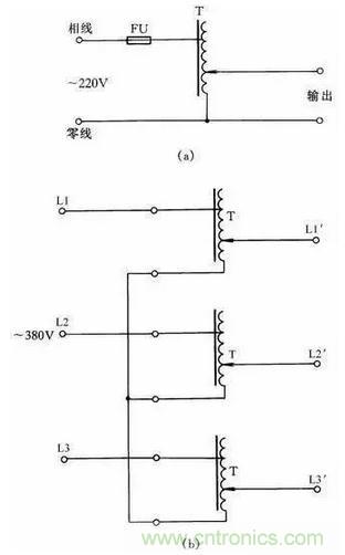 采用此法應注意兩點:一是在接線前必須把行燈變壓器次級一端與殼體的連接線(保護接地線)拆除;二是要注意行燈變壓器的初、次級繞組的電流都不能超過各自的額定電流值。