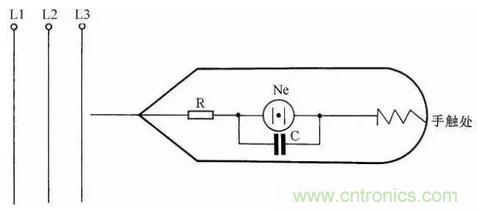 為了快速、準確地判斷,可在一般的低壓驗電筆的氖泡上并聯一只1500pF小電容,這樣在測強電時,電筆照常發光。而測得的是感應電時,感應電會通過電容再經過人體被大地吸收掉,所以電筆不發光。在自制這種驗電筆時應把電筆上串聯的保護電阻放在測電筆線路的最前端以保障安全,見圖36。