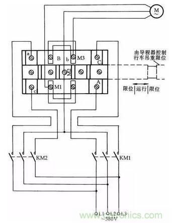 這里介紹一種常用限位器接線方法,這種限位器主要用于行車的上下電動機限位。當吊鉤高于限制位置時,它會使電動機自動斷開電源。這種方法一般是斷開主電機電源線,而不是用控制線控制接觸器通斷電動機停止限位,其優點是萬一接觸器觸點熔在一起不能斷開時,限位器同樣能起到保護限位的作用。其接線方法如圖38所示。