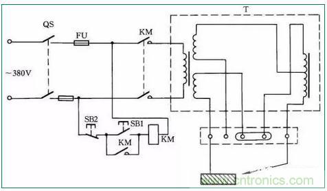 交流電焊機一般接法如圖39所示。當合上刀閘QS時,按下按鈕SB1,接觸器KM得電吸合;松開按鈕SB1時,KM自鎖觸點自鎖,電焊機繼續得電工作。當按下SB2時,電焊機停止工作。