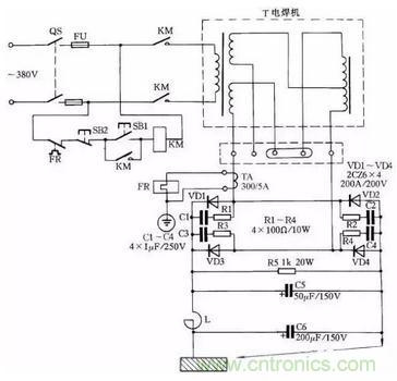 電路中VD1~VD4為4只硅整流二極管;R1~R4、C1~C4組成硅整流器件的過壓保護電路;FR為過流繼電器,保護硅整流器件。當負載電流超過額定值時,電流互感器次級電流相應增加,帶動繼電器FR動作,FR常閉觸點打開,接觸器KM釋放,觸點打開切斷電焊機電源。硅整流器件用0.25kW風扇作風冷設備。圖中,C5為濾波電容,R5為泄放電阻。