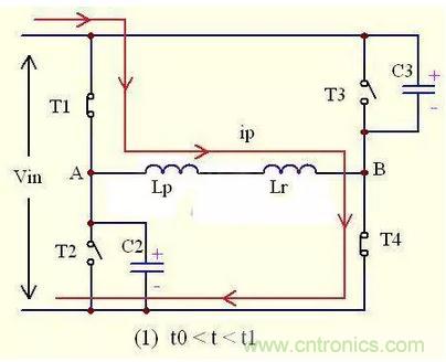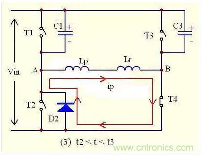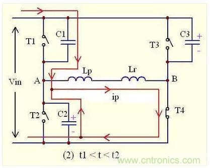 如上圖,此時T2與T3同時導(dǎo)通,T1與T4同時關(guān)斷,原邊電流ip的流向是T3—Lk—Lp—T2,如圖所示。