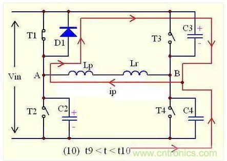 由于T3的關(guān)斷,原邊電流ip突然失去通路,但由電感的原理我們知道,原邊電流不允許突變,需要維持原來的方向,以一定的速率減少。所以,原邊電流ip會對C3充電,使C3兩端的電壓慢慢往上升,同時C4開始放電。即 ip(t)=-I2sinω(t-t9)