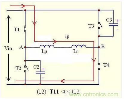 在t11-t12的時間內(nèi),副邊的二極管D1,D2還是同時導(dǎo)通流過電流,將副邊繞組短路,阻斷輸出電感反射到初級的途徑,此時的負(fù)載電流還是由次級電感與輸出電容提供;同時,由于原邊的T1,T4已經(jīng)導(dǎo)通,原邊電流ip流過T1--Lr—T4,又因為Lr很小,所以原邊電流ip就會正向急劇增大。