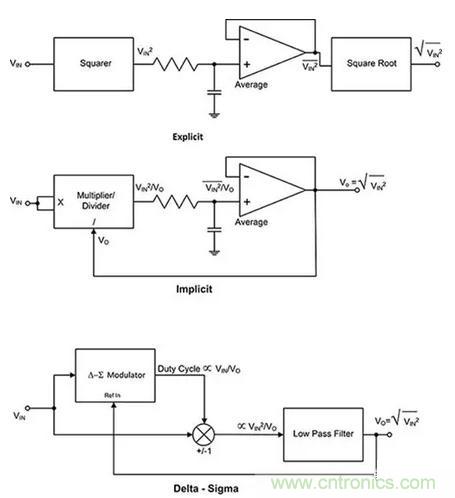 圖2:測量波形的RMS值有三種不同的方法:顯式、隱式和三角積分電路拓撲。(圖片來源:Digi-KeyElectronics)